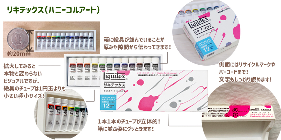 中高生や受験で使う機会のあるアクリル絵具・リキテックス。季刊エスやSSのメイキング、投稿作品でも馴染みのある画材です。ラミネートチューブのキャップある細かい溝がミニチュア版でも再現されています。絵具のラベルは、細かな文字はもちろんのこと、印刷された色が同じになることにもこだわられたそうです。箱の外観も細部まで再現されているので、見比べると楽しいですよ!