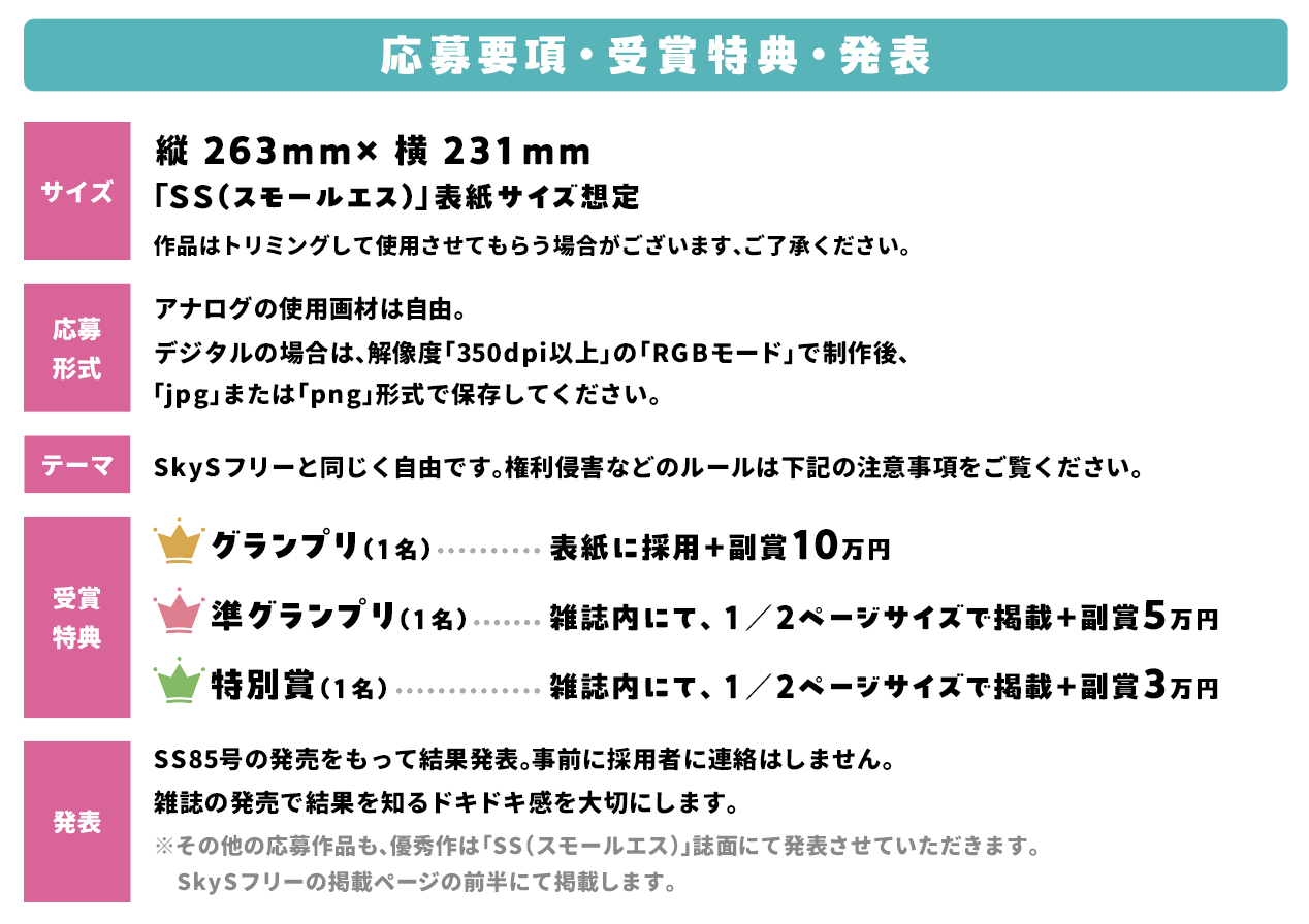 また、本企画は事前に採用者に連絡はせず、雑誌の発売で結果を知るという伝統的な投稿雑誌のドキドキ感を大切にします。皆さんで「SS(スモールエス)表紙イラストコンテスト」を一緒に盛り上げてください!