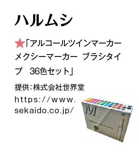ハルムシさんへの受賞商品を「アルコールツインマーカー メクシーマーカー ブラシタイプ 12色セット」と表記しましたが、正しくは「アルコールツインマーカー メクシーマーカー ブラシタイプ 36色セット」でございます。